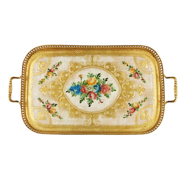 La BANDEJA GALLERY de forma rectangular con fondo de madera, borde de metal y adornos dorados y florales es una creación artística realizada totalmente a mano. Medidas aprox. L50*D27*H5.5cm El laboratorio “Soldi” produce desde hace más de 50 años productos de alta artesanía artística, con materiales seleccionados de la más alta calidad y técnicas de fabricación que tienen sus raíces en la más antigua tradición artística florentina. El maestro Claudio Soldi, en colaboración con su padre Marco, fundador del laboratorio en 1967, orgullosos de su clientela exclusiva y sensible a la más alta calidad, crean verdaderas obras de arte con gran pasión y competencia, donde la belleza se entrelaza con la armonía de colores y formas. . Inspirándose en los movimientos artísticos florentinos del siglo XV, el apogeo del Renacimiento florentino, Soldi continúa reproduciendo este estilo a través de su interpretación personal y más moderna. Todas las creaciones SOLDI, originales en su diseño y ejecución, están realizadas con maderas preciosas, trabajadas por manos expertas, pintadas y tratadas con colores y barnices completamente atóxicos. La amplia gama de productos elaborados por el laboratorio Soldi abarca desde muy variadas bandejas, objetos religiosos, así como ataúdes y recipientes diversos, auténtico Made in Italy en su máxima expresión. El regalo ideal para ti, tu familia, tus mejores amigos, así como para tu círculo profesional, ¡no te lo pierdas!