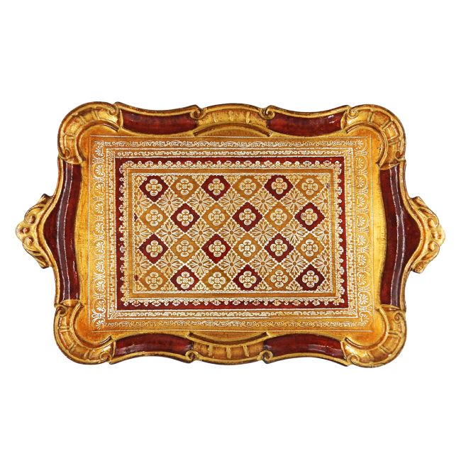 BANDEJA DORADA CON ALFOMBRA BURDEOS - La bandeja rectangular de estilo barroco es una creación artística hecha a mano de madera con adornos dorados y burdeos. Medidas aprox. 49,5 x 30,5 x 2,5 cm. El laboratorio “Soldi” produce desde hace más de 50 años productos de alta artesanía artística, con materiales seleccionados de la más alta calidad y técnicas de fabricación que tienen sus raíces en la más antigua tradición artística florentina. El maestro Claudio Soldi, en colaboración con su padre Marco, fundador del laboratorio en 1967, orgullosos de su clientela exclusiva y sensible a la más alta calidad, crean verdaderas obras de arte con gran pasión y competencia, donde la belleza se entrelaza con la armonía de colores y formas. . Inspirándose en los movimientos artísticos florentinos del siglo XV, el apogeo del Renacimiento florentino, Soldi continúa reproduciendo este estilo a través de su interpretación personal y más moderna. Todas las creaciones SOLDI, originales en su diseño y ejecución, están realizadas con maderas preciosas, trabajadas por manos expertas, pintadas y tratadas con colores y barnices completamente atóxicos. La amplia gama de productos elaborados por el laboratorio Soldi abarca desde muy variadas bandejas, objetos religiosos, así como ataúdes y recipientes diversos, auténtico Made in Italy en su máxima expresión. El regalo ideal para ti, tu familia, tus mejores amigos, así como para tu círculo profesional, ¡no te lo pierdas!
