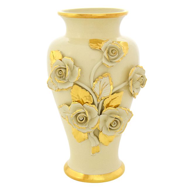 El JARRÓN ROSAS BRIOSO es una creación artística en cerámica de estilo barroco, con auténtico dorado en oro de 24k. Medidas aprox. Alto 31 x largo 17 cm. Las creaciones artísticas cerámicas de la empresa familiar italiana FL Orgia incorporan, desde 1965, décadas de experiencia artesanal en la fabricación de cerámica, en el característico estilo barroco. Objetos de este estilo y de factura muy compleja decoraron los ambientes y mesas más aristocráticos de Europa entre los siglos XVII y XVIII. Tierra, Agua, Aire y Fuego. Estas son las palabras claves de la Cerámica, un material con una historia milenaria. El sustantivo tiene origen en el griego Keramos (tierra cocida) y representó algo fundamental para el desarrollo de las civilizaciones pasadas, desde las civilizaciones maya, griega y romana, hasta la actualidad. Técnicas de refinamiento y pintura también en tonos Oro y Platino embellecen estos maravillosos objetos, dándoles un carácter de gran prestigio y exclusividad. Cada pieza es única, con la pequeña pero efectiva variación producida por el talento creativo del momento, hecha a mano por maestros artesanos tan hábiles como raros. FL Orgia garantiza que todos sus productos están íntegramente fabricados y decorados en sus laboratorios italianos, única y exclusivamente puro Made in Italy de la más alta calidad. Tanto en su entorno privado como en sus espacios de trabajo, un objeto artístico de cerámica de FL Orgia tendrá un efecto muy decorativo y elegante, en el límite entre un elemento de decoración y una joya. El regalo ideal para ti, tu pareja o tus mejores amigos; No te lo puedes perder, por suerte sólo te separa un clic.