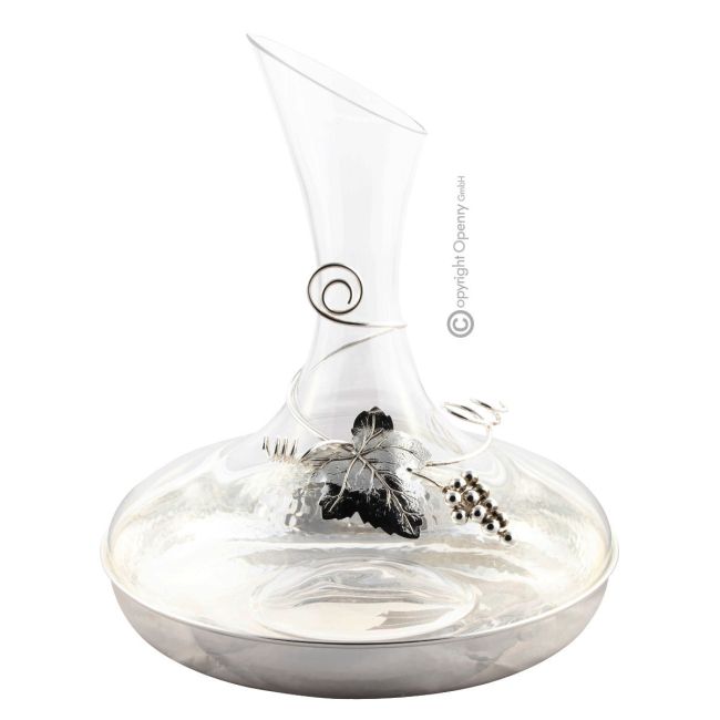 DECANTER CON TRONCO DE HOJA DE UVA con Fondo de Plata Jarra de Agua de Vino en Elegante Combinación de Cristal y Plata Martillado a Mano Chapado Antioxidante Especial Made in Italy *1,5l