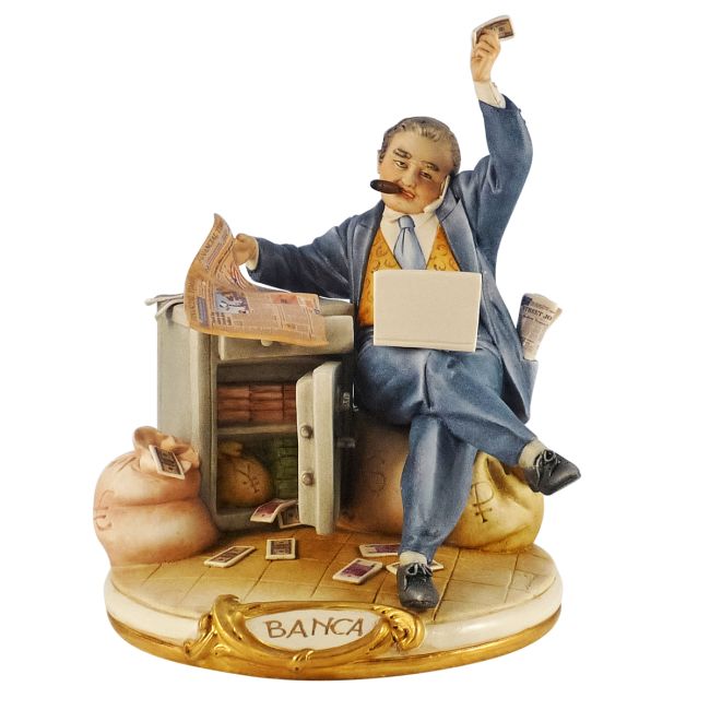 BANCHIERE es una creación artística en porcelana de Capodimonte. Medidas aprox. L23*H29*D21 El primer taller de porcelana de Europa fue fundado en 1743 en Capodimonte por Carlos III de Borbón, rey de Nápoles y las Dos Sicilias. Uno de los pocos herederos que continúa con pasión y entusiasmo esta antigua escuela y que con el tiempo se ha ganado la admiración de expertos y coleccionistas de todo el mundo es el taller de porcelana Príncipe, fundado en 1975 cerca de Vicenza. Heredero de una escuela que ha llevado al mundo el gusto y la creatividad de la porcelana italiana durante más de 250 años, Príncipe ha sabido combinar la creatividad napolitana con la originalidad veneciana, representando hoy un ejemplo de continuidad, investigación e innovación en el campo de la tradición. . Príncipe unió las diferentes personalidades de los tres artistas: Luciano Cazzola, escultor, Lino Gobbi, creador de formas y Sergio Traforetti, pintor, quienes lograron fusionar armoniosamente sus respectivas experiencias creando una rica producción que combina la atención al detalle con la cálida suavidad de los colores. . A través de los complementos de decoración existe el deseo de recrear, con absoluta fidelidad, copias de obras de época, mediante el uso de técnicas y materiales lo más parecidos posible a los utilizados por los artistas originales. Por su singularidad, estas reproducciones representan verdaderos objetos de arte para decoración y también constituyen una oportunidad interesante para los coleccionistas. Cada obra de arte sale de los laboratorios Príncipe marcada individualmente y acompañada de un certificado original que certifica su autenticidad y creación totalmente artesanal. El regalo ideal para ti, tu familia, tus mejores amigos, así como para tu círculo profesional, ¡no te lo pierdas!