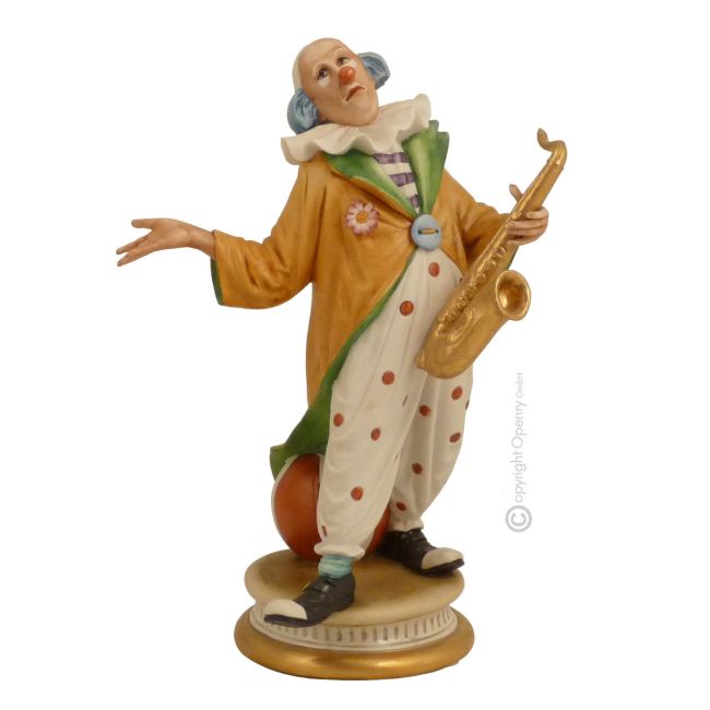PAYASO CON SAXOFÓN es una creación artística en porcelana de Capodimonte. Medidas aprox. L14*H27cm El primer taller de porcelana de Europa fue fundado en 1743 en Capodimonte por Carlos III de Borbón, rey de Nápoles y las Dos Sicilias. Uno de los pocos herederos que continúa con pasión y entusiasmo esta antigua escuela y que con el tiempo se ha ganado la admiración de expertos y coleccionistas de todo el mundo es el taller de porcelana Príncipe, fundado en 1975 cerca de Vicenza. Heredero de una escuela que ha llevado al mundo el gusto y la creatividad de la porcelana italiana durante más de 250 años, Príncipe ha sabido combinar la creatividad napolitana con la originalidad veneciana, representando hoy un ejemplo de continuidad, investigación e innovación en el campo de la tradición. . Príncipe unió las diferentes personalidades de los tres artistas: Luciano Cazzola, escultor, Lino Gobbi, creador de formas y Sergio Traforetti, pintor, quienes lograron fusionar armoniosamente sus respectivas experiencias creando una rica producción que combina la atención al detalle con la cálida suavidad de los colores. . A través de los complementos de decoración existe el deseo de recrear, con absoluta fidelidad, copias de obras de época, mediante el uso de técnicas y materiales lo más parecidos posible a los utilizados por los artistas originales. Por su singularidad, estas reproducciones representan verdaderos objetos de arte para decoración y también constituyen una oportunidad interesante para los coleccionistas. Cada obra de arte sale de los laboratorios Príncipe marcada individualmente y acompañada de un certificado original que certifica su autenticidad y creación totalmente artesanal. El regalo ideal para ti, tu familia, tus mejores amigos, así como para tu círculo profesional, ¡no te lo pierdas!