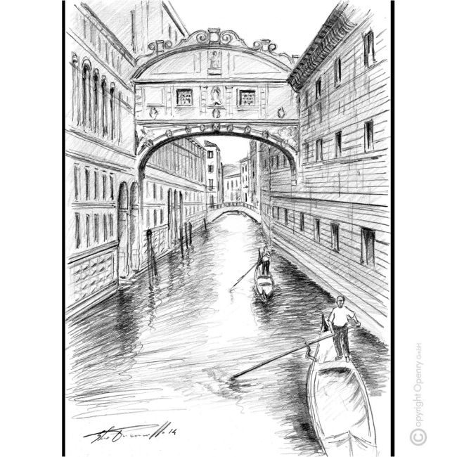 PUENTE DE LOS SUSPIROS - VENECIA Dibujo a lápiz sobre cartón moderno Made in Italy