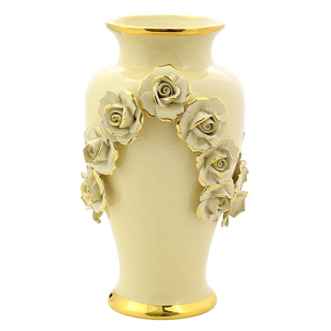 El JARRÓN ROSETA es una creación artística en cerámica de estilo barroco, con auténtico dorado en oro de 24k. Medidas aprox. Alto 31 x largo 22 cm. Las creaciones artísticas cerámicas de la empresa familiar italiana FL Orgia incorporan, desde 1965, décadas de experiencia artesanal en la fabricación de cerámica, en el característico estilo barroco. Objetos de este estilo y de factura muy compleja decoraron los ambientes y mesas más aristocráticos de Europa entre los siglos XVII y XVIII. Tierra, Agua, Aire y Fuego. Estas son las palabras claves de la Cerámica, un material con una historia milenaria. El sustantivo tiene origen en el griego Keramos (tierra cocida) y representó algo fundamental para el desarrollo de las civilizaciones pasadas, desde las civilizaciones maya, griega y romana, hasta la actualidad. Técnicas de refinamiento y pintura también en tonos Oro y Platino embellecen estos maravillosos objetos, dándoles un carácter de gran prestigio y exclusividad. Cada pieza es única, con la pequeña pero efectiva variación producida por el talento creativo del momento, hecha a mano por maestros artesanos tan hábiles como raros. FL Orgia garantiza que todos sus productos están íntegramente fabricados y decorados en sus laboratorios italianos, única y exclusivamente puro Made in Italy de la más alta calidad. Tanto en su entorno privado como en sus espacios de trabajo, un objeto artístico de cerámica de FL Orgia tendrá un efecto muy decorativo y elegante, en el límite entre un elemento de decoración y una joya. El regalo ideal para ti, tu pareja o tus mejores amigos; No te lo puedes perder, por suerte sólo te separa un clic.