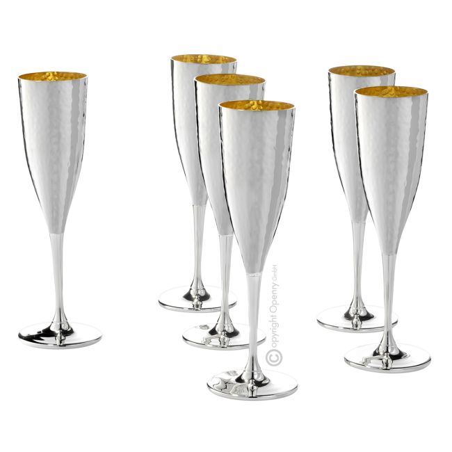 Juego de copas FLUTE GLASS hechas a mano con un baño especial de oro, plata y antioxidación.<br/> Medidas aprox. Alto 23 x profundidad 5,5 cm.<br/> Bragagnolo Argenti es una empresa artesanal fundada en 1978 en Cittadella, ciudad medieval entre los dos centros históricos de Padua y Vicenza, zona de excelencia en la artesanía platera.<br/> Bragagnolo Argenti ha destacado desde el principio entre los plateros italianos por su originalidad en el diseño de los productos y su dedicación a la más completa artesanía.<br/> La búsqueda continua de nuevos productos con profundas raíces y tradiciones proporciona una mezcla de belleza y armonía en todas las creaciones de Bragagnolo Argenti.<br/> Las copas de la línea Fine Wine Tasting son la herramienta ideal para quienes aman el sabor del vino y para quienes saben apreciar las cosas únicas, revolucionando la moderna técnica de degustación, asegurando el éxito garantizado de cada vino. Gracias a su forjado patentado aportan al sabor del vino un toque final adicional, compacto y equilibrado.<br/> El martillado propone una antigua técnica de orfebrería italiana que hace que el metal sea más homogéneo, nunca poroso, fácilmente pulido y más resistente; los particulares hoyuelos estimulan la oxigenación del vino. Bragagnolo Argenti ha desarrollado el proyecto "argentoè" que hace de las propiedades de la plata su punto de partida para el desarrollo de ideas innovadoras donde la elegancia se combina con la funcionalidad. Made in Italy al más alto nivel.<br/> El regalo ideal para ti, tu familia, tus mejores amigos, así como para tu círculo profesional, ¡no te lo pierdas!<br/>